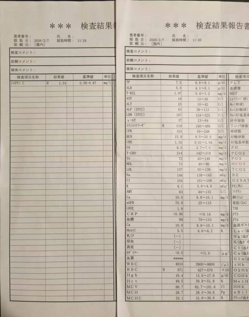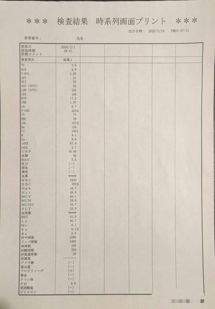その努力の成果か、LDL(悪玉コレステロール)は基準値内に収まり、クレアチニンもわずかに下がった。これは素直に嬉しい。心理的な不安も、幾分かは和らいだ気がした。